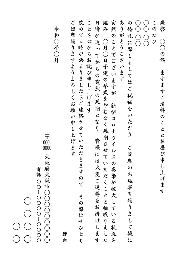 ○月○日予定の挙式をやむなく延期させていただくことと相成りました