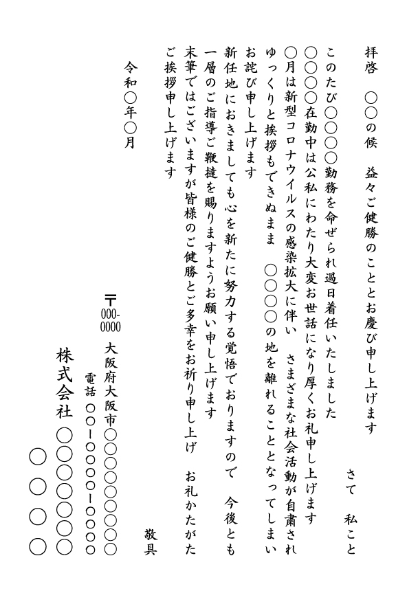 ゆっくりと挨拶もできぬまま○○○○の地を離れることとなってしまい