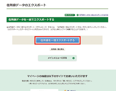 住所録データのエクスポートページにある「住所録を一括エクスポートする」ボタンをクリックしてください。