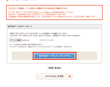 ファイル名が入った状態で「住所録データをインポートする」ボタンクリックしてください。