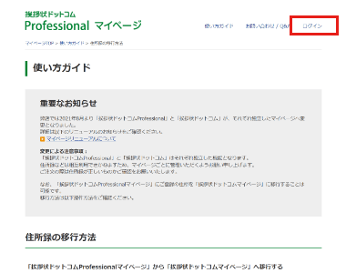 挨拶状ドットコムProfessionalサイトからのログインの場合は、サイト右上にある「ログイン」ボタンより、マイページへのログインが可能です。