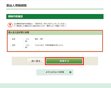 差出人情報ページで、削除したい差出人情報の枠内にある「削除する」ボタンをクリックしてください。