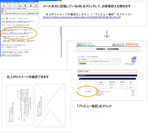 校正メールで仕上がりイメージを確認して、修正がある場合は、メール、またはお電話でお知らせください。(※修正は3回まで無料)