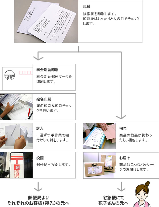印刷された商品200枚のうち、180枚は、宛名印刷・料金別納印刷後に封入されて、郵便局に投函されます。残りの20枚は投函と同日に、花子さんの元に発送されます。